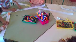Una vez hechas las formas, a cada una se le asignó un color y en tiras de papel hemos plasmado nuestras series monstruosas siguiendo unos modelos.